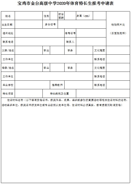 考生申报:符合报考条件的考生,请考生本人或其监护人于2020年7月19日18:00前上交《宝鸡市金台高级中学2020年体育特长生报考申请表》到金台高级中学教务处刘老师。