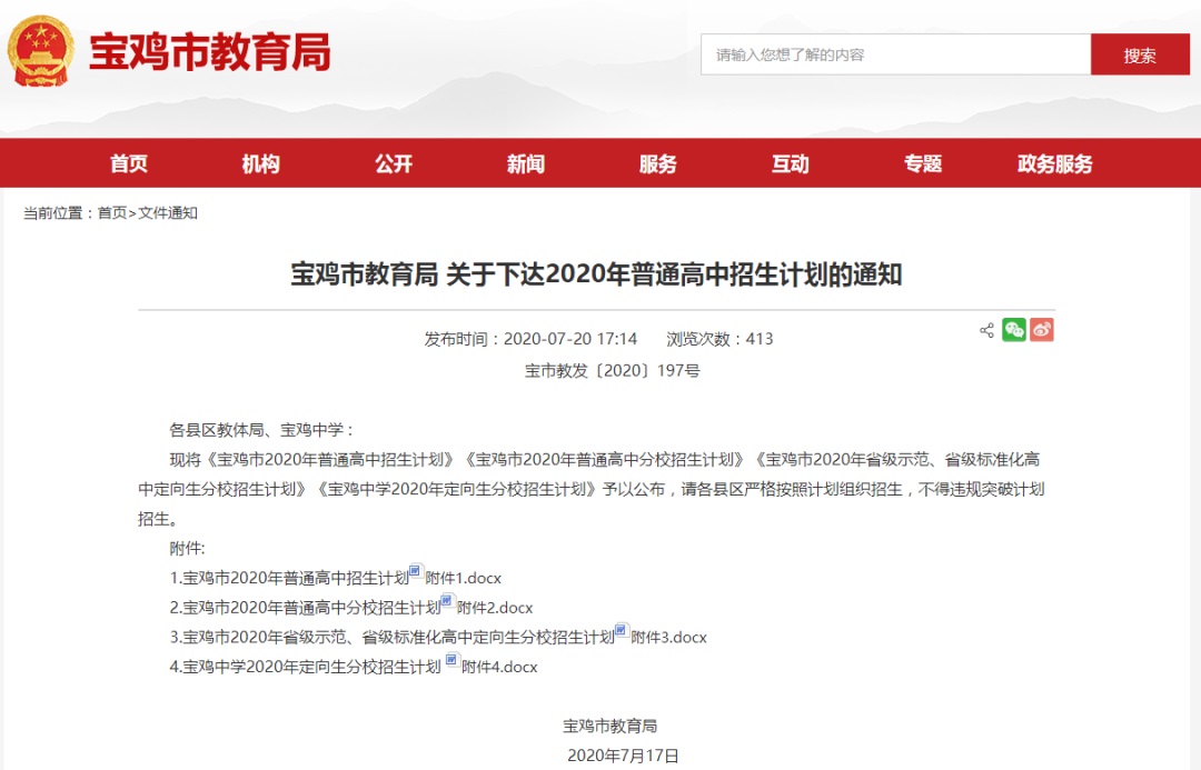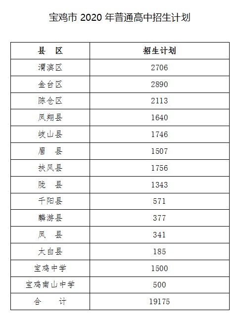 宝鸡市教育局关于下达 2020年普通高中招生计划的通知