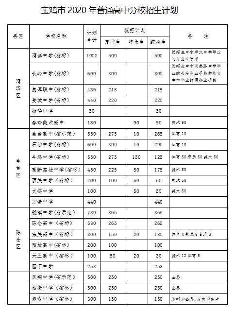 现将《宝鸡市2020年普通高中招生计划》《宝鸡市2020年普通高中分校招生计划》《宝鸡市2020年省级示范、省级标准化高中定向生分校招生计划》《宝鸡中学2020年定向生分校招生计划》予以公布,请各县区严格按照计划组织招生,不得违规突破计划招生。