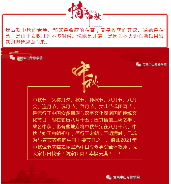 宝鸡中山专修学院祝您牛年中秋节快乐!