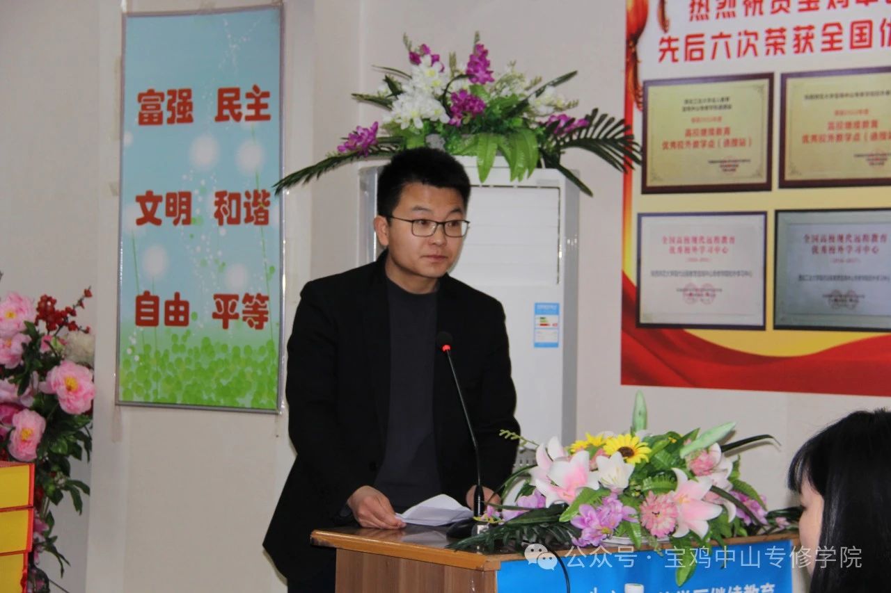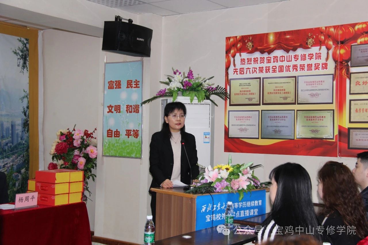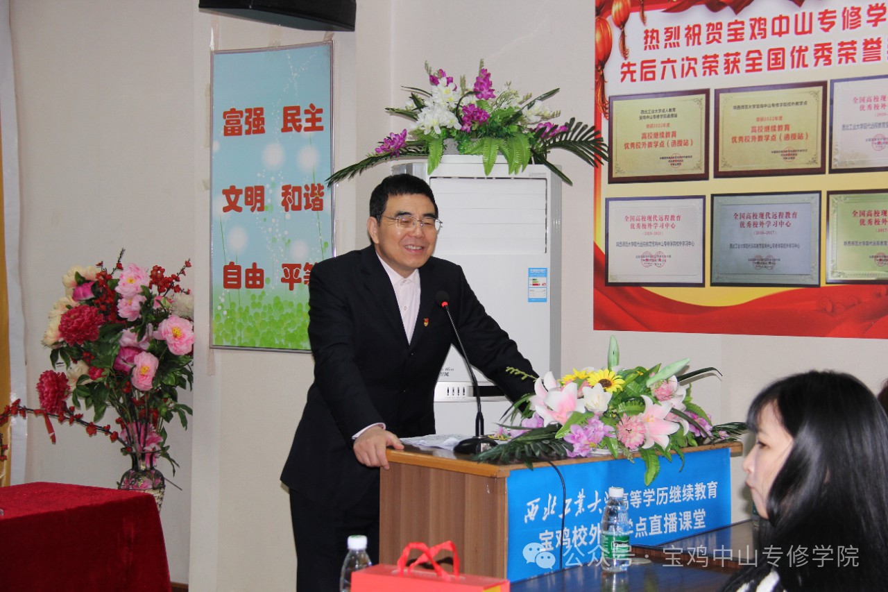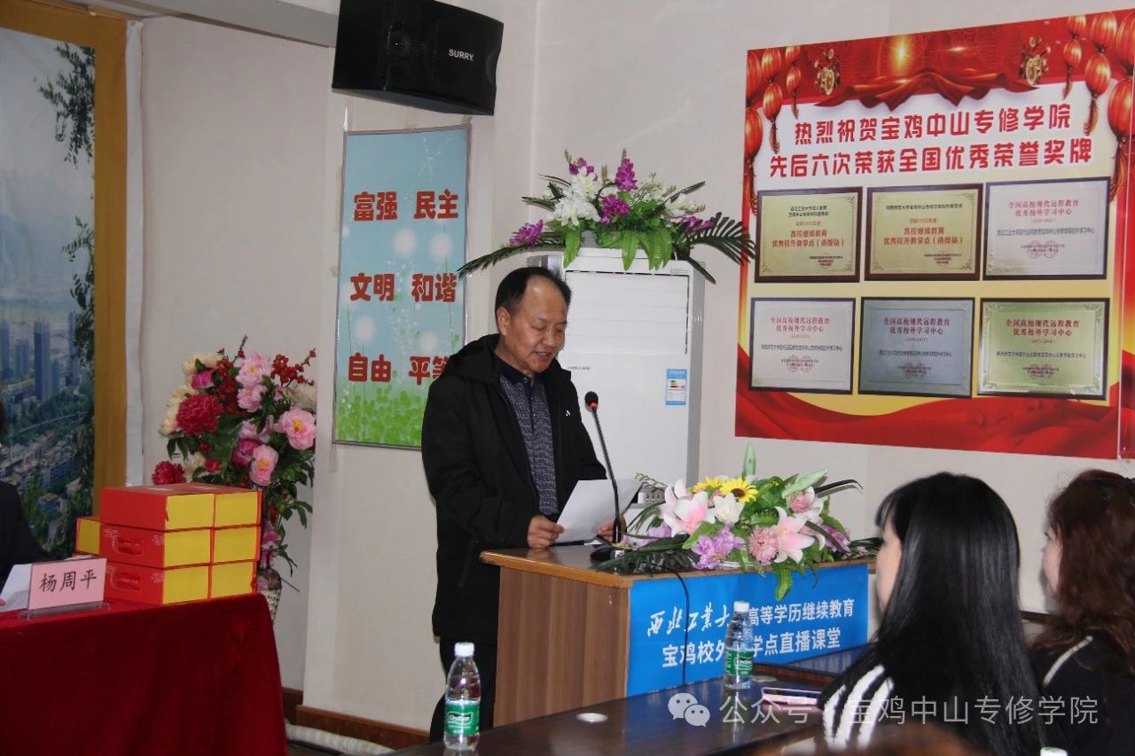 宝鸡中山专修学院杨周平副院长代表学院师生向顺利毕业的同学们表示最热烈的祝贺!祝贺同学们通过自身努力,圆满完成学业,顺利毕业。杨院长在祝辞中说:两年半前,同学们为了一个共同的目标,来到宝鸡中山学习中心继续深造,组成了一个温馨而又充满朝气的大家庭,从此开启了自己成人高等教育的求学之路。岁月不居,时节如流。转眼间就毕业了,中国有句古话“肺腑之言,留给别时”。回顾两年半学习,生活的点点滴滴,每位同学一定感慨良多,不是两年半太遥远,而是时间过的太匆忙,成人学历教育求学之路的艰辛,将是大家人生旅途难以忘记的回忆。两年半来大家通过成人网络教育,由陌生到相识,由相识到相知,结识了许多来自不同行业,不同地域的朋友,扩大了自己的朋友圈,这里有难忘的同学情、师生情,留下无数美好记忆。这将是同学们人生最宝贵的财富。毕业不是结局,毕业只是学习和生活的开始。希望大家一定要始终坚守“终身学习”的理念,不忘初心,砥砺前行。读书学习,不只为获取知识,更为实现自我增值,是提高核心竞争的最好方式!杨院长希望同学们不负韶华,只争朝夕,追逐梦想,脚踏实际,奋斗不息。最后,祝福大家家庭幸福,工作顺利,前程似锦!