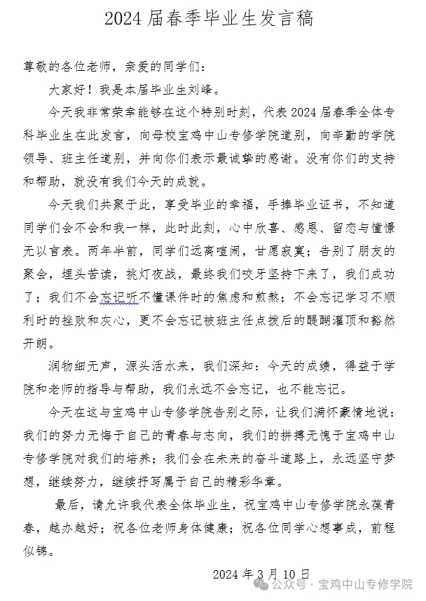 ——毕业生代表刘峰同学的发言及发言稿
