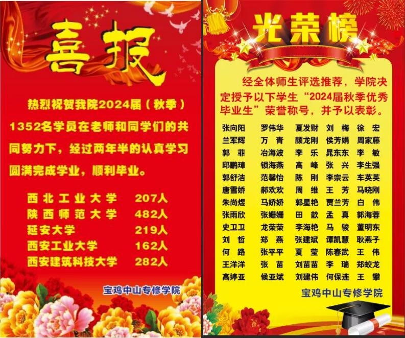 2024年7月27日至28日,在宝鸡中山专修学院三楼多媒体教室隆重举行了西北工业大学、西安工业大学、陕西师范大学、延安大学、西安建筑科技大学等院校成人继续教育毕业生典礼。我院全体教职工及各院校毕业生代表出席了本次典礼,我们欢聚一堂共同祝贺1352名同学圆满完成学业顺利毕业!